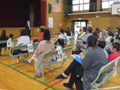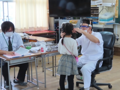 10月28日(水)午後、令和3年度入学生「就学時健康診断」を実施しました。今年度はコロナ禍により居住校区の小学校で健診を受けることになっています。本校では密を避けるため、2部制とし、例年の5年生の引率もなくしました。保護者の方に手を引かれて、健診場所の教室に向かい、聴力・視力・耳鼻科【写真右】・眼科【写真右】・歯科・内科の健診を一人ずつ受診しました。