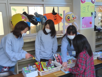 廊下では「当て物」「ストラックアウト」が行われました、1番から10番までが特賞で、大きなボールがもらえます。 「鬼滅の刃」の商品が人気でした。