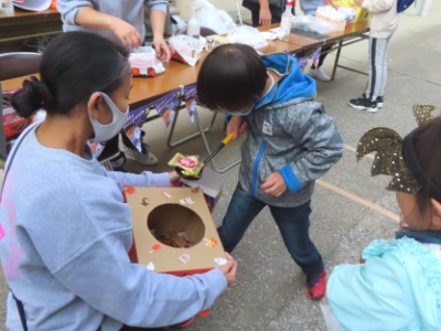 「お菓子すくい」は、箱の中のお菓子をお玉で2回すくえます。高学年になるほど、何回もやり直していました。