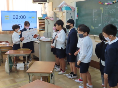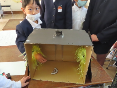 4年の教室では、「ブラックボックス」をしていました。箱に手を突っ込んで、分度器などの文房具や日用品を当てるゲームです。