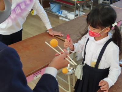 「宝さがし」は、教室の中に隠した宝を探していくゲームです。制限時間は2分間で、いくつ宝を探すかを競いました。「ピンポン玉はこび」は、1・2年生はお玉で、3・4年生はスプーン、5・6年生はお箸を使って、ピンポン玉をゴールまではこぶゲームです。途中でうちわをあおいで邪魔をされます。