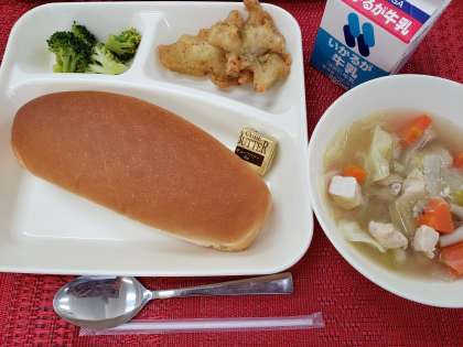 11月9日(月)のこんだては、「コッペパン、バター、白身魚のフリッター、洋風煮、ブロッコリーのサラダ、牛乳」です。