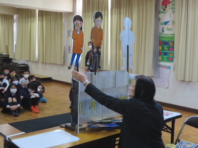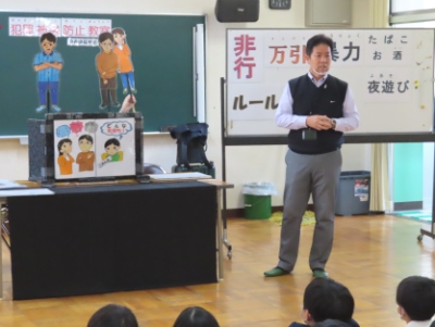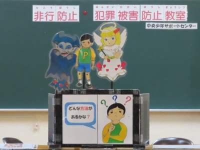 子どもたちが非行をしないための3つの大切なこと(・社会のルールを守る ・非行に誘われても断る勇気をもつ ・思いやりの気持ちを持つ)について、ペープサート(紙人形劇)でわかりやすく教えていただきました。また、SNSで注意することやネット犯罪についても、教えていただきました。