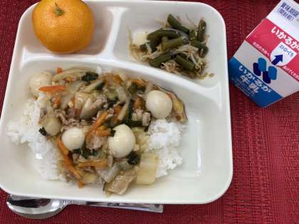 「中華丼」は、豚肉、うずら卵を主材に、はくさい、たまねぎ、たけのこ、にんじん、にら、しょうが、しいたけを使用しています。【うずら卵】の個別対応献立です。おいしくいただきました。