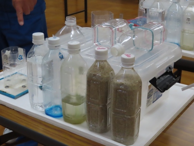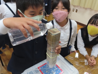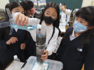 DVDで水道水がどのようにして作られているのかを学んだあと、浄水処理実験を体験しました。班別に分かれて、川の水の砂ろ過【写真左】と粒状活性炭【写真右】による浄水実験をしました。ろ過をすると透明度が一気にあがり、驚きました。
