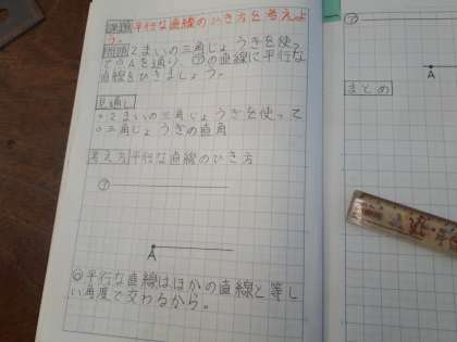 もとの直線に三角定規を合わせ、もう一方の三角定規をそれにぴったり合わせて、ずらしながら平行な直線を引きました。このやり方は、「平行な直線は他の直線と等しい角度で交わる」ことを使ったものであることも学習しました。