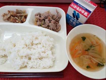 12月10日(木)のこんだては、「ごはん、豚肉のねぎじょうゆ焼き、すまし汁、れんこんのおかかいため、牛乳」です。