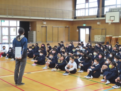 式後、4年生は2限に体育館で学年集会を行い、4年担当の先生から学年の「3学期の目標」についてお話がありました。