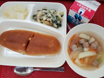 1月8日(金)のこんだては、「パン、ほたて貝のグラタン、スープ、和なし(カット缶)牛乳」です。