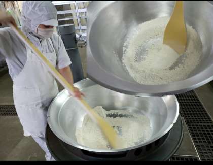 「ほたて貝のグラタン」は、小麦粉を釜でいためて、粉臭さをとっています。このひと手間でグラタンがとてもおいしくなります。今日も調理員さんが小麦粉を大きな釜でいためてくださいました。おいしくいただきました。