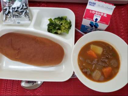 「ビーフシチュー」は、小麦粉と油で作ったブラウンルウを作り、牛肉とにんじん、じゃがいも、たまねぎ、青みにグリンピースを使用した児童に人気の献立です。おいしくいただきました。
