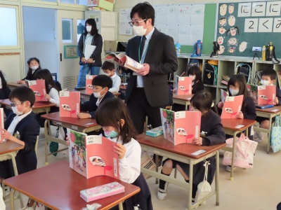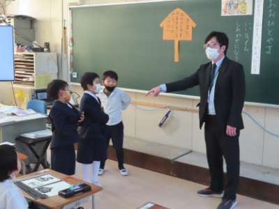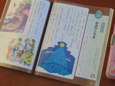 1月13日(水)5限、1年2組は道徳「すこしぐらい」の学習でした。教材は「おおひとやま」で、山に登った村人が幸せになれるという噂の石を一つずつ持って帰るというお話です。