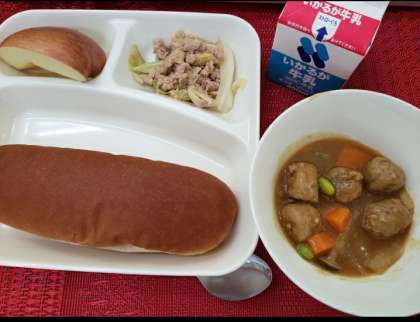 1月20日(水)のこんだては、「パン、ミートボールと野菜のカレー煮、ツナとキャベツのソテー、りんご、牛乳」です。