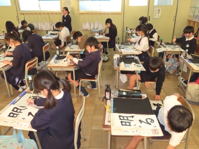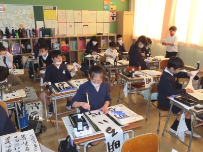 3年生は10月から「3クラス編成」とし、1クラスが42人から28人になり、教室内も余裕ができました。2時間続きの毛筆の授業でしたが、集中して取組むことができました。