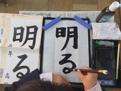 1月20日(水)5・6限、3年3組は教室で初めての「書き初め」を行いました。「明るい心」を書く書写の授業は3回目ですが、「条幅紙」に書くのは初めてでした。