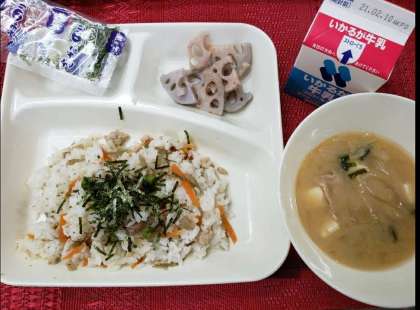 「鶏ごぼうご飯」は、具を給食室で作り、教室でごはんと具を盛りつけて混ぜて、「混ぜご飯」にします。それに、きざみのりをふりかけて食べます。おいしくいただきました。