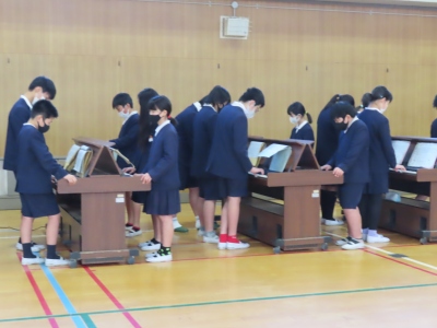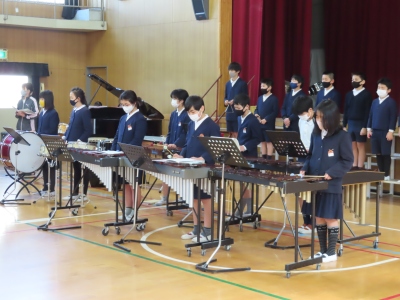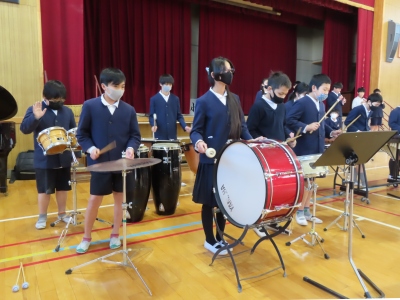 2月10日(金)4限、6年生全員が講堂に集まり、「学習発表会」に向けて、合奏練習をしていました。