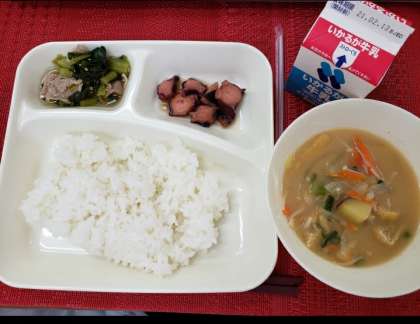2月8日(月)のこんだては、「ごはん、泉だこのやわらか煮、みそ汁、こまつなの煮びたし、牛乳」です。