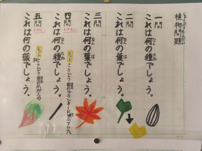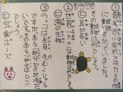 「昔、長吉小学校ではカメの他に動物を飼っていました。その動物は?」「テントウムシは何のふりをする?」など、動物や植物、鳥、昆虫、魚のに関する問題が出題されています。子どもたちは一生懸命、考えていました。