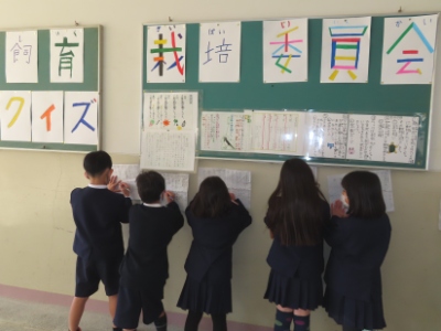 2月9日(火)昼休み、放送室前の掲示板に貼られている「飼育栽培委員会クイズ」の前には、いつも答えを考える児童がいます。