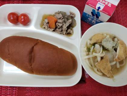 2月15日(月)のこんだては、「パン、豚肉とごぼうの煮もの、なにわうどん、プチトマト、牛乳」です。
