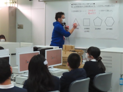2月16日(火)6限、5年1組はパソコン教室で、算数科「多角形と円をくわしく調べよう」の公開授業がありました。