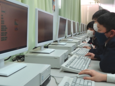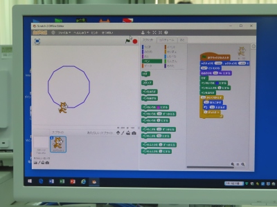 正多角形の性質を倫理的に考えて、プログラミングで描くことが目標です。「scratch」のアプリを使って、辺の長さや角度を入れていきます。なかなかうまく描けませんでしたが、先生からヒントを教えてもらい、全員が正三角形を描くことができました。できた児童から、正六角形や正八角形、正多角形をプログラミングしていきました。大阪市においては、児童「一人一台タブレット」に伴い、次年度にはパソコン教室のパソコンは、撤去する予定です。