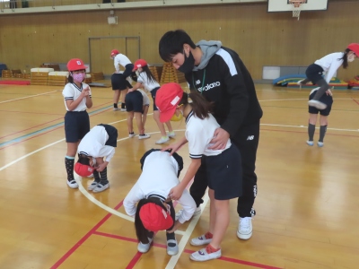 跳び箱やマット、踏切板の準備も、子どもたちだけで5分で並べ終わりました。各グループで準備運動を行ったあと、感覚づくりのために、馬跳びやうさぎ跳び、カエルの足打ちをしました。