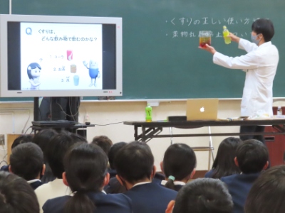 2月18日(木)5限、学校薬剤師の先生に来ていただき、「くすりの正しい使い方講座」の授業がありました。前半はくすりの正しい使い方のお話でした。くすりはコップ1杯の水で飲まないと、食道の途中でくすりが止まってしまい、炎症を起こす危険性があることや、お酒でくすりを飲んではいけない(命に関わる時がある)ことなどを教えてもらいました。
