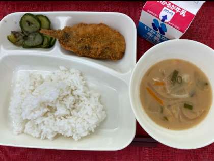 3月1日(月)のこんだては、「ごはん、いわしのフライ、みそ汁、きゅの赤じそあえ、牛乳」です。