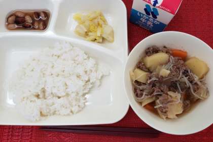 3月3日(水)のこんだては、「ごはん、肉じゃが、はくさいのゆず風味、とら豆の煮もの、牛乳」です。