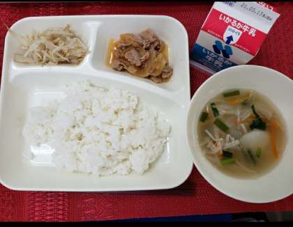 3月8日(月)のこんだては、「ごはん、豚肉のコチジャンいため、トック、もやしのナムル、牛乳」です。