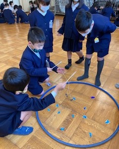3月9日(火)3限、1年1組と2年1組は、教室で「おもちゃランド」を行いました。