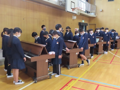 3月8日(月)3限、6年生は明日の「学習発表会」に向けて、最後の練習をしました。6人用オルガンや木琴、鉄筋、打楽器、リコーダーなど音楽室にあるすべての楽器を用いて演奏します。