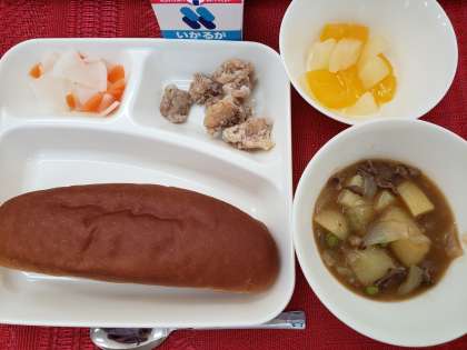 3月9日(火)のこんだては、「パン、フライドチキン、カレーシチュー(近江牛)、おいわいピクルス、フルーツゼリー、牛乳」です。