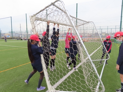 天然芝と人口芝のグラウンドに分かれて、サッカーやドッジボールをします。自分たちでゴールの設置も行いました。
