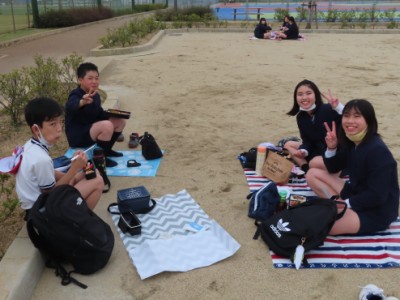 12時30分からは、広場でグループに分かれて、お弁当をいただきました。黙食に努めながらも、久しぶりに楽しい昼食になりました。