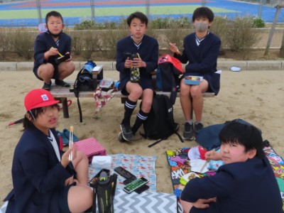 昼食後は空模様も怪しくなり、ポツリポツリと雨が降ってきましたが、学校まで傘をささずに、14時に帰ることができました。今回の「スポーツ交流会」の取組は初めてで、先生方やPTAの支えがあって実現しました。卒業を前に、きっといい思い出ができたことでしょう。