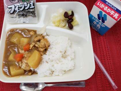 「チキンカレーライス」に、ラッキー人参が登場しています。ラッキー人参が登場すると、児童はとても喜んで、楽しく給食を食べてくれています。今年度のラッキー人参は今日で終了です。来年度4月からの給食にも登場するので、楽しみに待っていてください。おいしくいただきました。