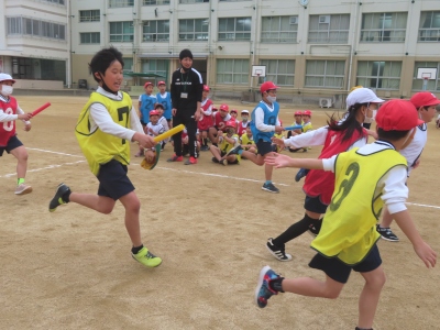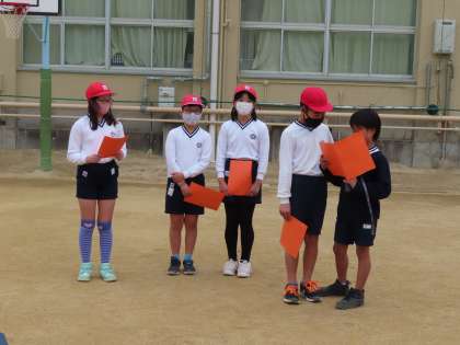 3月16日(火)5限、4年3組と2年3組は、運動場で「なかよしペア学年交流会」を行いました。4年生がリードをして、進行していきました。