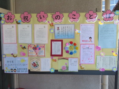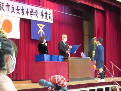 国歌・市歌斉唱の後、6年生は校長先生から卒業証書を、一人ずつ授与していただきました。学校長式辞では、「夢の実現に向かって自立を」という、心からの祝福と激励のエールが贈られました。