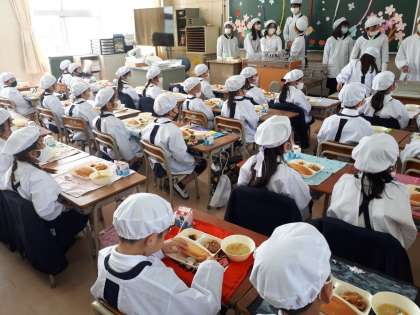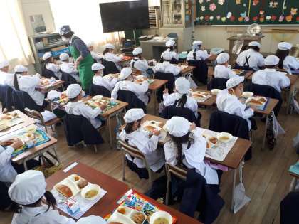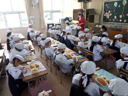 しばらくは6年生が運搬・配膳のお手伝いをしてくれます。新型コロナウイルス感染症拡大予防のため、全員が前を向き、6年生が配膳してくれるのを静かに待っていました。