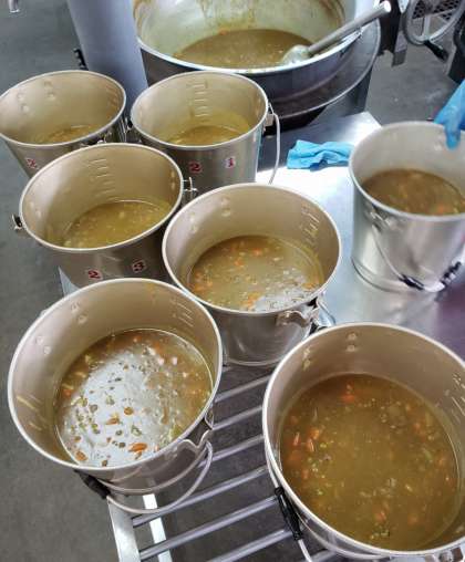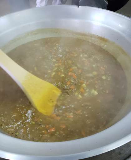 今日は「入学祝い献立」です。児童に好評なカツカレーライスです。一口とんかつを冷凍のまま揚げます。1年生のご入学のお祝いを祝して、調理員さんがにんじんを手切りしてハート形の「ラッキー人参」もカレーの中にはいっています。おいしいくいただきました。