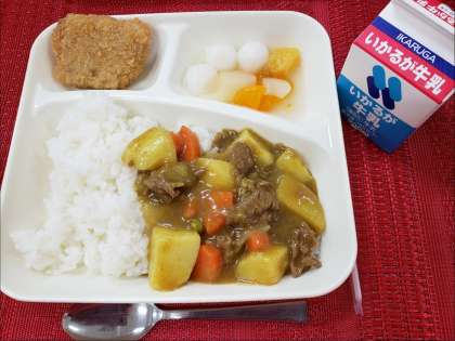 今日のこんだては、「カツカレーライス、フルーツ白玉、牛乳」です。