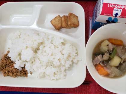 今日のこんだては、「鶏肉とじゃがいもの煮もの、ものあつあげのしょうゆだれかけ、紅ざけそぼろ、牛乳」です。