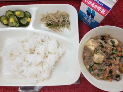 今日のこんだては、「ごはん、マーボー豆腐、きゅうりとコーンの甘酢あえ、もやしとピーマンのごまいため、牛乳」です。