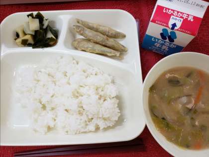 今日のこんだては、「ごはん、きびなごてんぷら、豚汁、わかたけ煮、牛乳」です。
