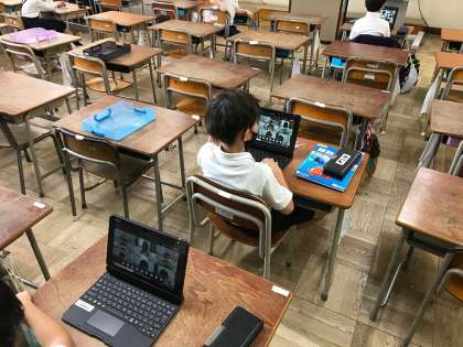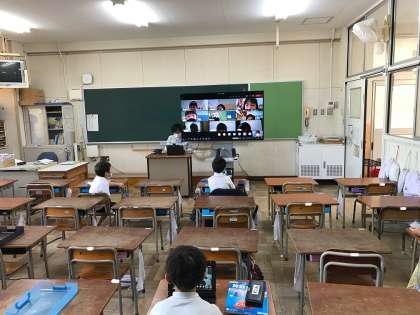 教室からの接続は回線が少し込み合って接続に時間がかかる人もいましたが、最後はみんな先生とオンラインでつながったことを確認することができました。