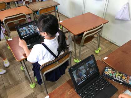 3年生は教室の先生と家庭の子どもたち、教室にいる子どもたちとオンラインでタブレット画面を通じてお友だちとつながるテストをしました。