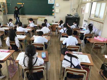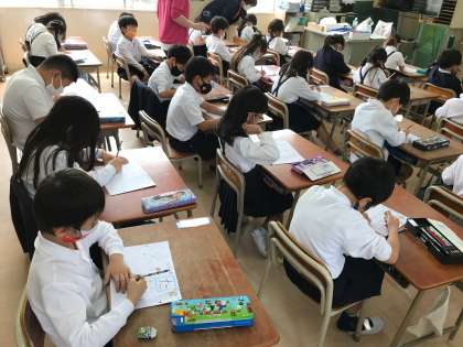 1年生の教室では、国語のひらがなの学習、算数の数の学習の確認、練習をしていました。